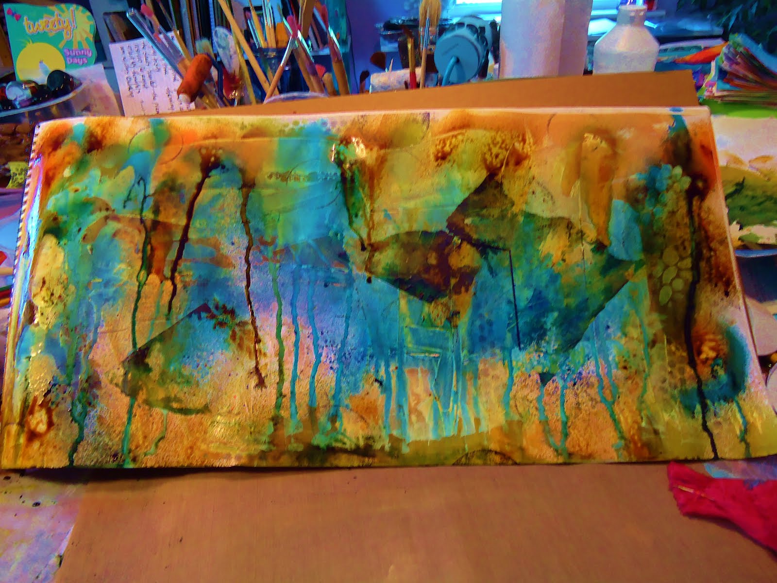 This was originally made with many layers of acrylic paint, waxed paper, original photography,torn paper, made foam stamps, a couple of magazine images, altered and reworked. It's about poster sized.